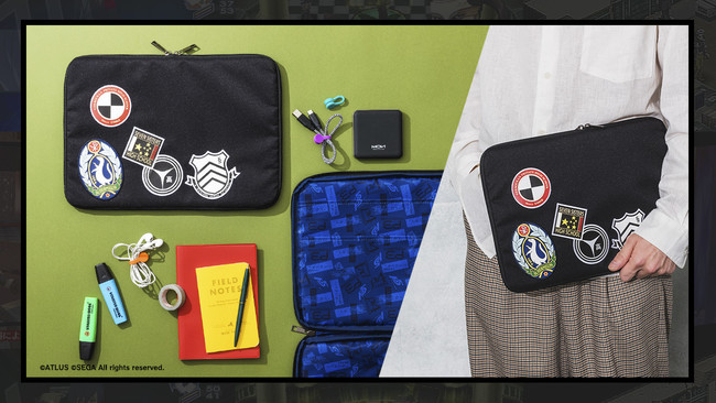 ペルソナシリーズで主人公が通う各学校のエンブレムが立体的なワッペンのようにデザインされたA4サイズのマルチポーチです。内生地はベルベットルームカラーのブルーを基調にした作品タイトルの総柄仕様で、収納に便利な大小さまざまなポケットも付いています。スペシャル感のある25周年のタグもポイントです。厚みのあるウレタンクッション入りなので、タブレットや身の回りのガジェット収納にも使えます。さらに裏側には英語で「我は汝、汝は我」のおなじみのセリフが箔押しされていたりと、ファンにはうれしいデザインを楽しみながら、いつでもペルソナの世界を持ち歩くことができます。