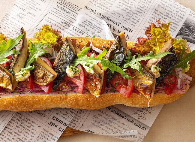 塩釜市 間宮商店の金華山沖で獲れた寒鯖のバケットサンド ほか