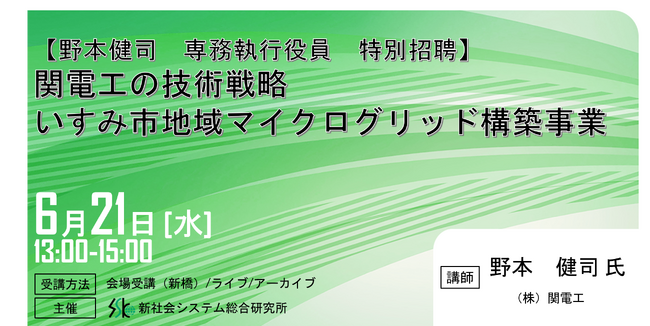 「関電工の技術戦略マイクログリッド構築事業」と題して、(株)株式会社関電工 専務執行役員 戦略技術開発本部 戦略事業ユニット長 野本 健司 氏によるセミナーを2023年6月21日(水)に開催!!