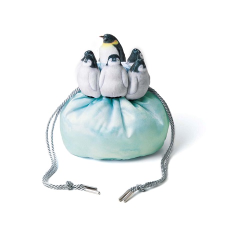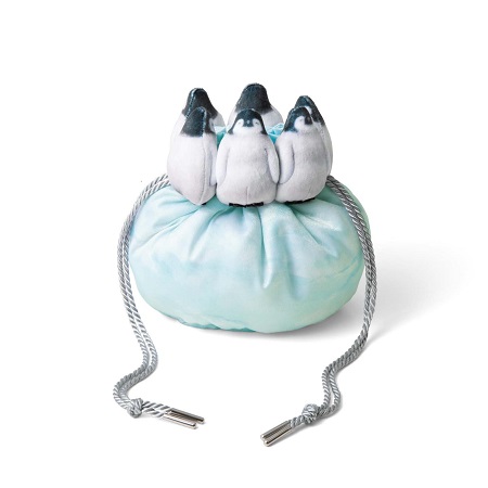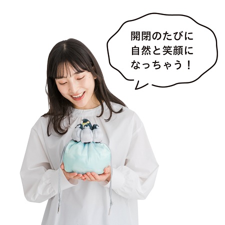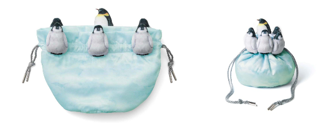 ひもをしぼると、離れ離れのペンギンたちがむぎゅっと大集合します。身を寄せ合って寒さに耐えるペンギンたちを巾着で再現しました。