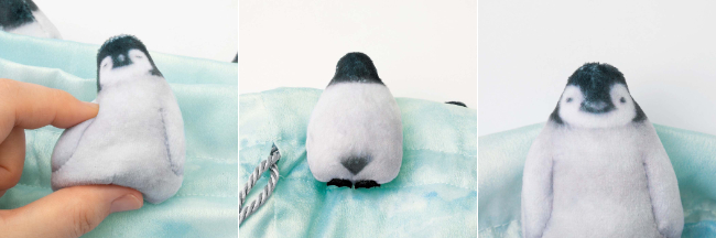 ペンギンは、おもわずつまみたくなる、もっちりぷにぷにボディーです。かわいらしいじんわりしたしっぽの後ろ姿もポイントです。目を開いているヒナもいます。