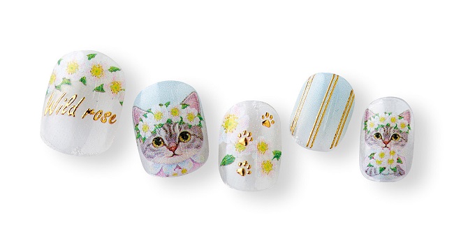貼るだけで簡単に、お花の妖精猫さんのネイルアートが完成します。草花の中に小さな肉球があるのも猫好きさんにはうれしいポイントです。つめより少し小さめのシールを貼って、お手持ちのトップコートを塗れば、ぷっくりつやつやのジェル風ネイルの仕上がりが楽しめます。