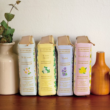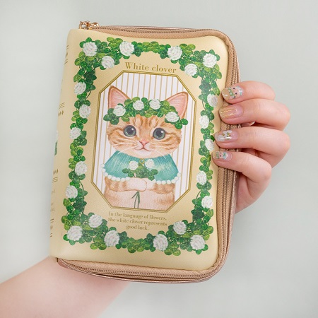 お花の妖精になったメルヘンな猫さんが描かれた植物図鑑風のミニポーチです。お化粧直しに必要な最低限のメイク道具がすっぽり入るサイズで、バッグに入れて持ち運びしやすいのもポイントです。背表紙を並べて図鑑をそろえるように楽しむこともできます。