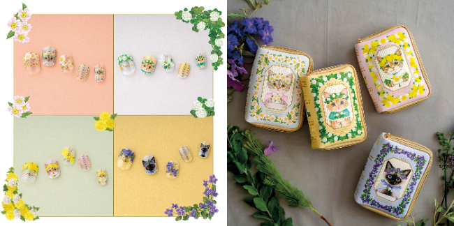 お花の妖精になったメルヘンな猫さんが描かれた「指先にキラリと花咲くネイルシール」と「植物図鑑風ポーチ」がフェリシモ「猫部(TM)」から登場