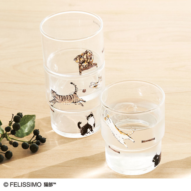 スタッキングできるグラスの上下に描かれた2匹の猫さんからストーリーが想像できるグラスです。