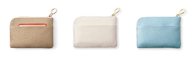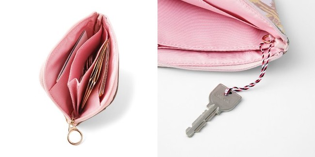 厚さ約1cmのスリムなボディーの中に、小銭を入れるのに便利なポケット(中央)や、お守りやカードなどが入れられるポケット(両サイド)が付いています。サイズは、ちょうど二つ折りにしたお札が入るくらいの大きさです。手持ちのひもなどでかぎを付けられるDカンも付いています。