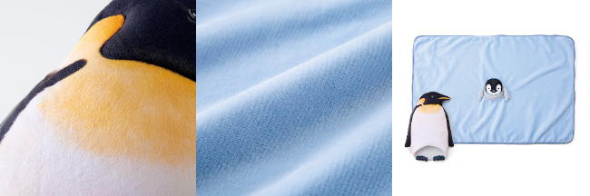 ペンギンの毛並みもリアルに再現。氷をイメージしたブランケットはあたたかいボア素材です。かわいい親子のセットで届きます。