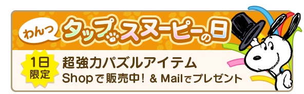 『スヌーピー パズルジャーニー』では、毎月1日を「“わんっ”タップスヌーピーの日」とし、当日ログインした方限定で、超強力なパズルアイテム『オールクラッシュ』を1個受け取れます。『オールクラッシュ』はShopでも1日限定で販売を行いますので、パズルを快適に進めたい方は、この機会をお見逃しなく!