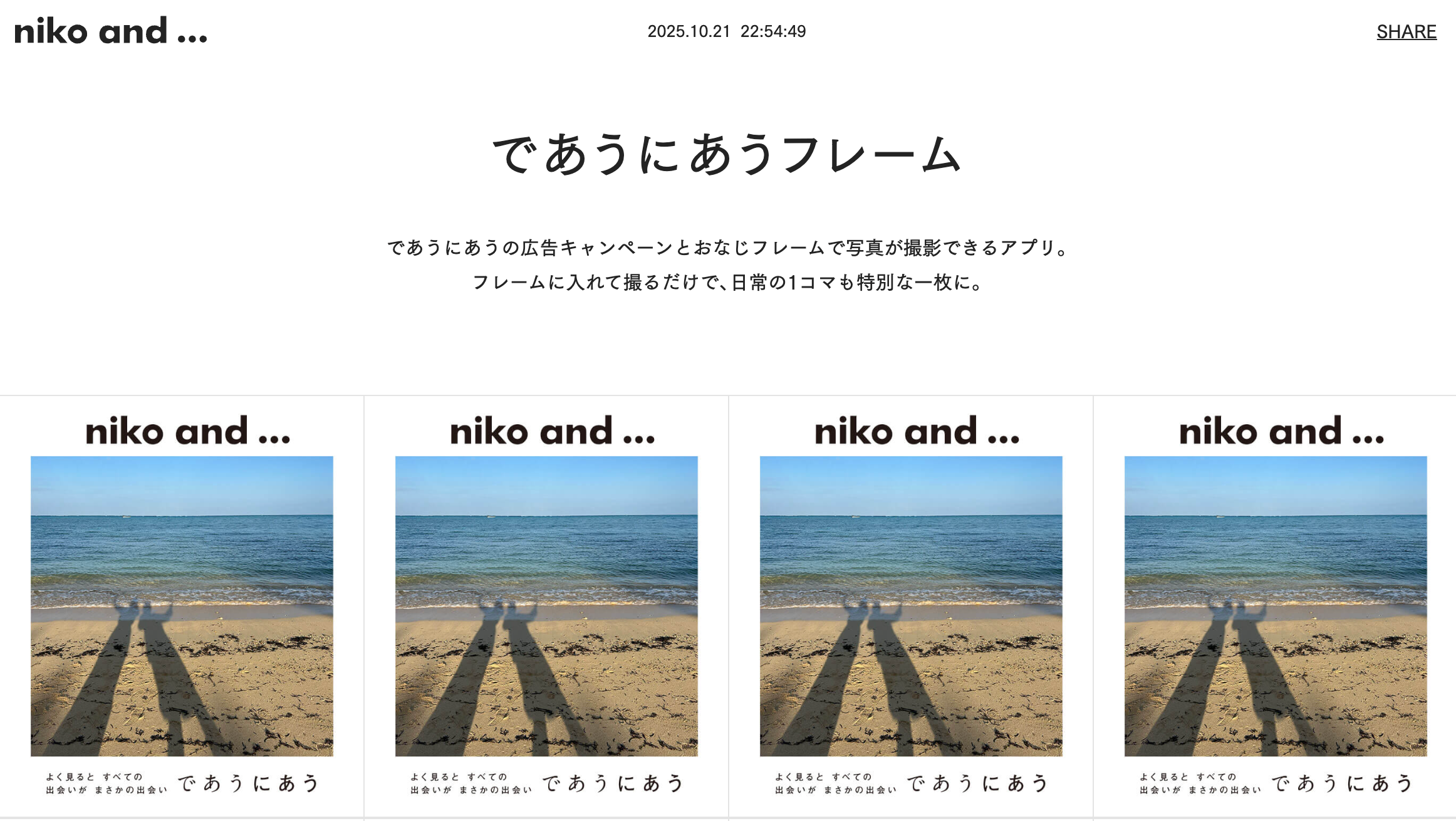 複数人のカメラマンが切り取った“思いがけない出会い”の瞬間をお楽しみいただけます。 さらに、キャンペーンビジュアルのフレームで日常を撮影できる「であうにあうフレーム」など、ここだけの特別な体験も。