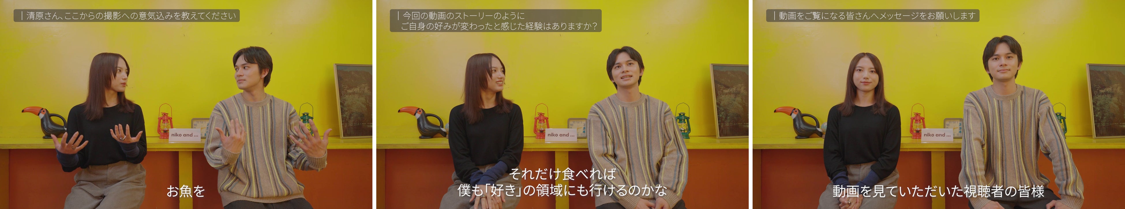 「niko and ...」の撮影で久しぶりに会った感想や、”であうにあう”というキーワードにちなんで最近出会ったお気に入りなどについて聞きました。北村さんは、28歳の誕生日を前に「27歳はほぼ一つの作品にずっと携わって、人生をリアルに考える年だった」、清原さんは、最近のお気に入りについて「金沢に1人旅に行って出会った花瓶」と近況を明かしました。