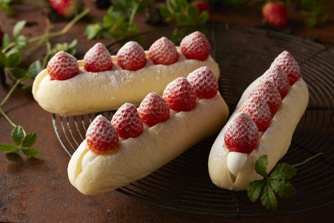 ペストリー商品は「プティルージュ」「タルトフレーズ」「紅いもといちごのティラミス」、ベーカリー商品は「いちごメロンパン」「ストロベリーミルクブレッド」「Fraise」が登場します。旬のいちごを使用した、華やかな商品を取り揃えました。