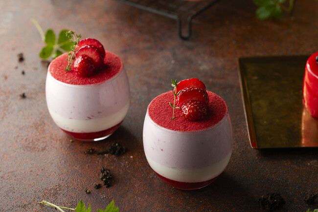 最下部にはいちごのコンポートゼリーを詰め、その上には豆乳ホイップを使ったティラミスクリーム、ジェノワーズ、沖縄紅いもパウダーといちごを合わせたティラミスクリームを重ねました。トップはいちごパウダーとフレッシュないちごでデコレーションした、4層のグラデーションが美しい一品です。