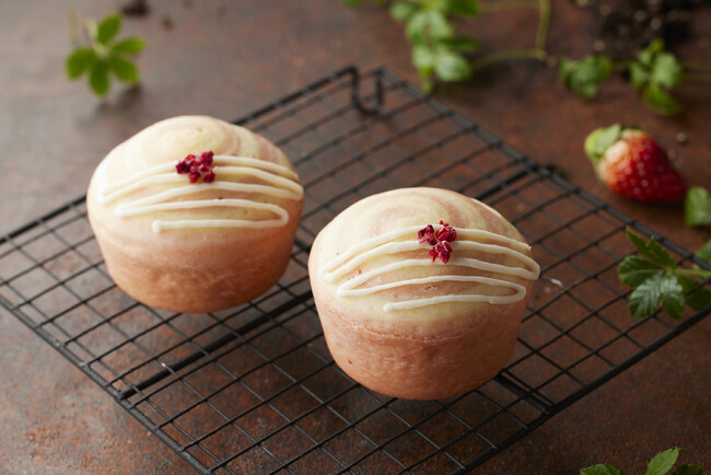 フランスでは朝食の定番として多くの人に親しまれている「パン・オ・レザン」をレーズンではなくいちごでアレンジ。いちごの濃縮ペーストを練りこんだ生地とプレーン生地を重ね、渦巻き状に焼き上げました。