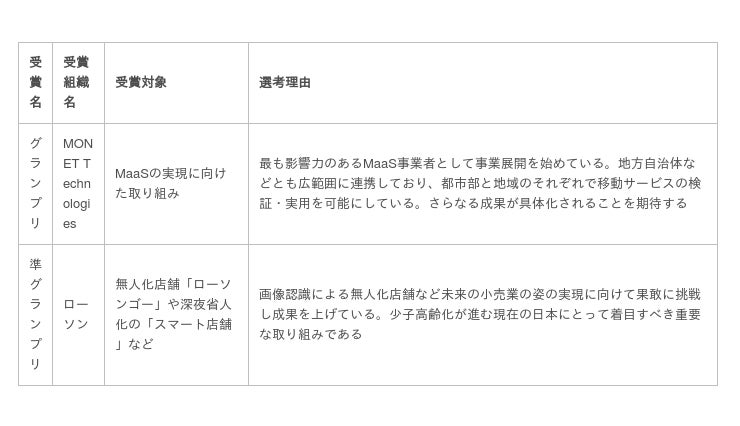 『Impress DX Awards 2019』の総合グランプリは、新たな移動サービスであるMaaS(Mobility as a Service)の推進に向けた取り組みを展開するMONET Technologiesが受賞されました。選定理由は、「最も影響力のあるMaaS事業者として事業展開を始めている。地方自治体などとも広範囲に連携しており、都市部と地域のそれぞれで移動サービスの検証・実用を可能にしている。さらなる成果が具体化されることを期待する」です。