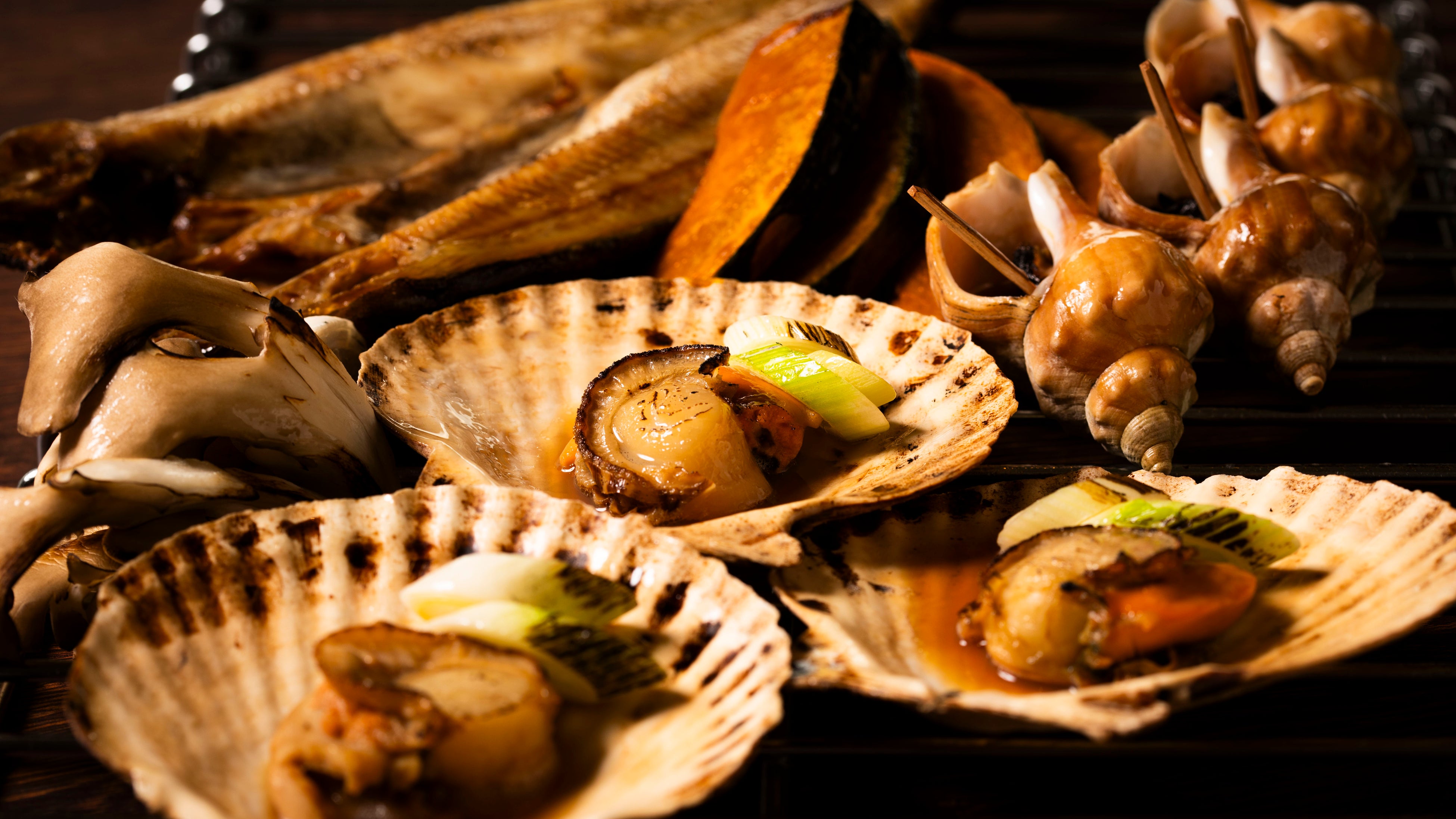 「炉端焼き風 北海道近海の恵みとホタテの殻焼き」