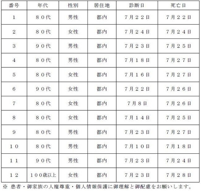 都内で新型コロナウイルスに感染した方が死亡されましたのでお知らせします。