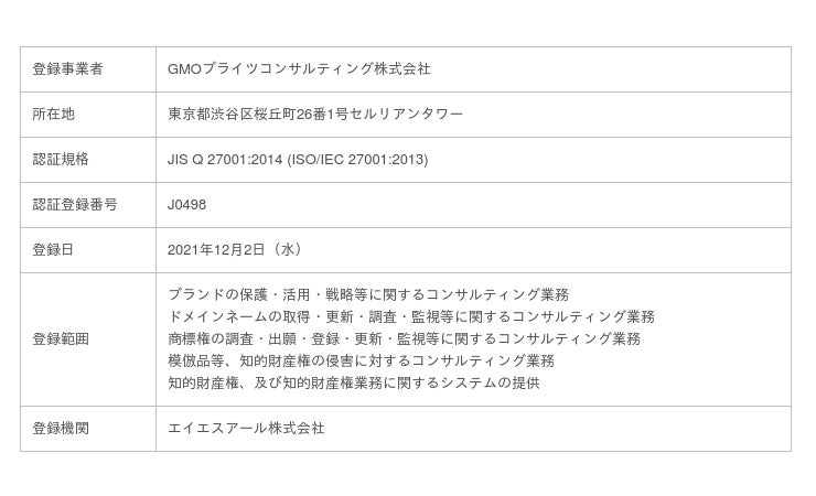 GMOインターネットグループでブランドセキュリティサービスを提供するGMOブライツコンサルティング株式会社(代表取締役社長:中川光昭 以下、GMOブライツコンサルティング)は、本社(渋谷セルリアンタワー)を適用範囲とし、ISMS(情報セキュリティマネジメントシステム)認証基準の国際規格「ISO/IEC 27001:2013」(※1)および国内規格「JIS Q 27001:2014」(※2)の認証を、2021年12月2日(木)付で取得しましたのでお知らせいたします。