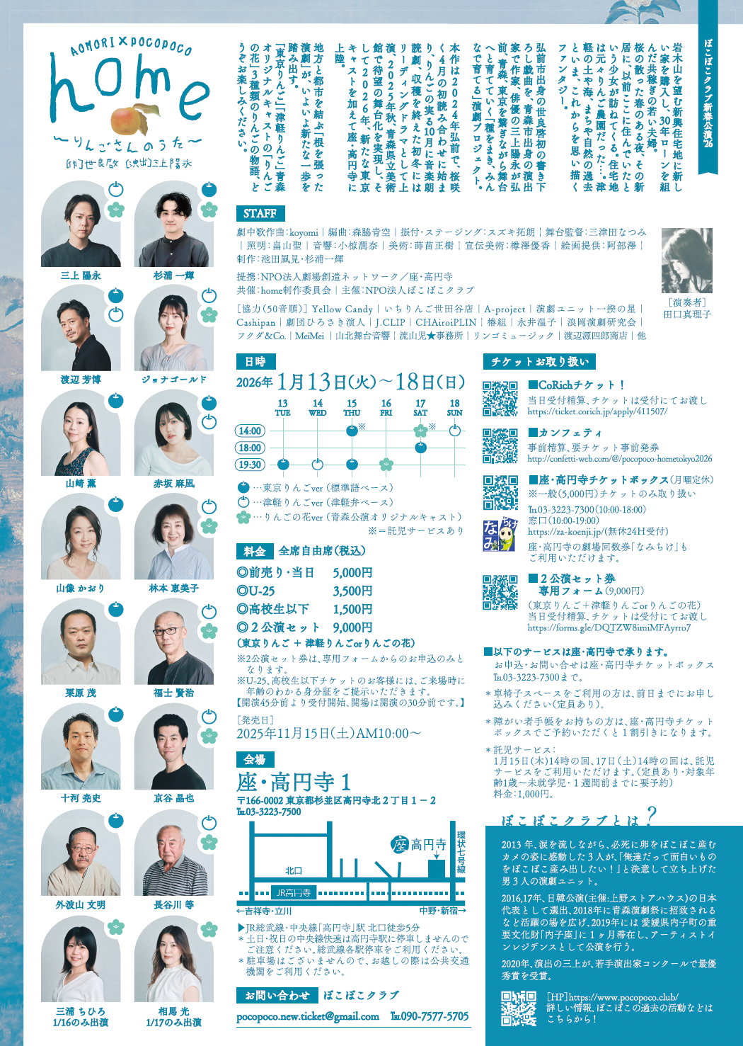 ぽこぽこクラブ主催、新春公演’26 AOMORI×POCOPOCO『home〜りんごさんのうた〜』が2026年1月13日 (火) 〜 2026年1月18日 (日)に座・高円寺1(東京都 杉並区 高円寺北 2-1-2)にて上演されます。 チケットはカンフェティ(運営:ロングランプランニング株式会社、東京都新宿区、代表取締役:榑松 大剛)にて発売中です。