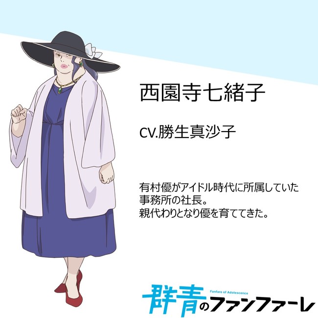 主人公・有村優がアイドル時代に所属していた事務所の社長 西園寺七緒子役を勝生真沙子が、競馬場で優と出会う現役騎手 久慈凱久役を浪川大輔が演じます。メインキャラクターである競馬学校の生徒のみならず、彼らを取り巻く大人たちの活躍にもご期待ください。