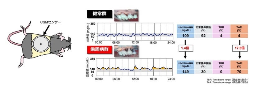 国立大学法人岡山大学(本部:岡山市北区、学長:那須保友)の大学院医歯薬学総合研究科歯周病態学分野の高盛萌可大学院生、同大学学術研究院医歯薬学域(歯)歯周病態学分野の大森一弘准教授、高柴正悟教授、同大学学術研究院医歯薬学域(医)腎・免疫・内分泌代謝内科学分野の和田淳教授らの研究グループは、口腔疾患である歯周病の進行が糖尿病の病態に関与する血糖値の日内変動を悪化させることを、持続型血糖測定(Continuous Glucose Monitoring:CGM)センサーを装着した歯周病マウスモデルを用いて実証しました。