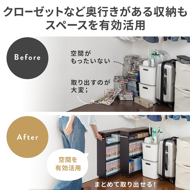本製品は、押し入れやクローゼットにDVDやCD、ゲームソフトなどのメディアやコミックなどを収納することができるキャスター付き収納ラックです。
