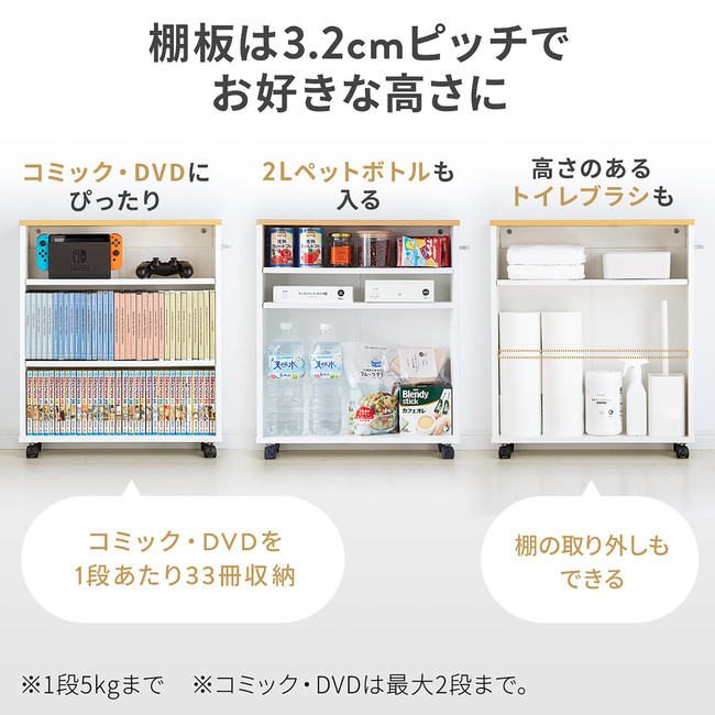 可動式の棚板で収納品に合わせて棚板の設置高さを3.2cm間隔で上下に調整することができます。