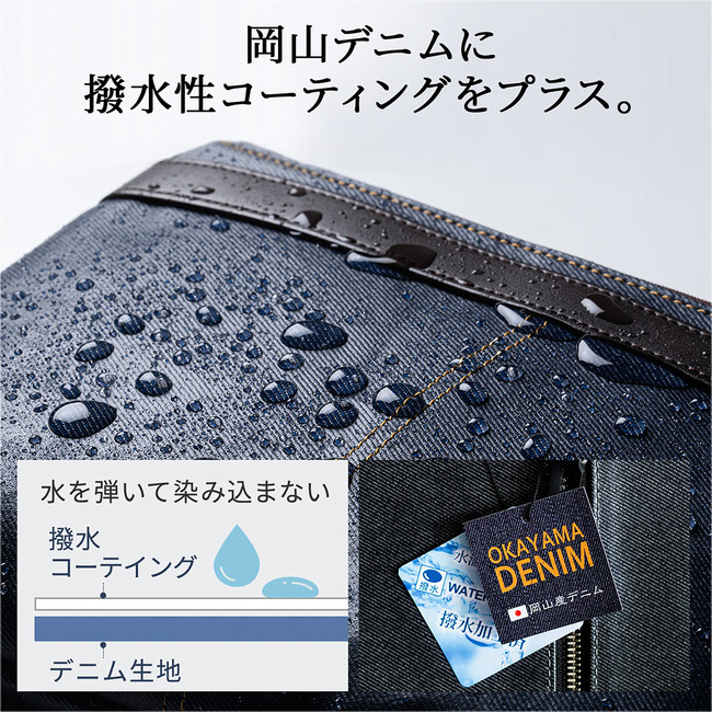 素材は、パワフルな使用にも耐えるデニム生地を採用し撥水コーティングでサラッとした手触りで雨や汚れ、色落ちなども防ぎます。