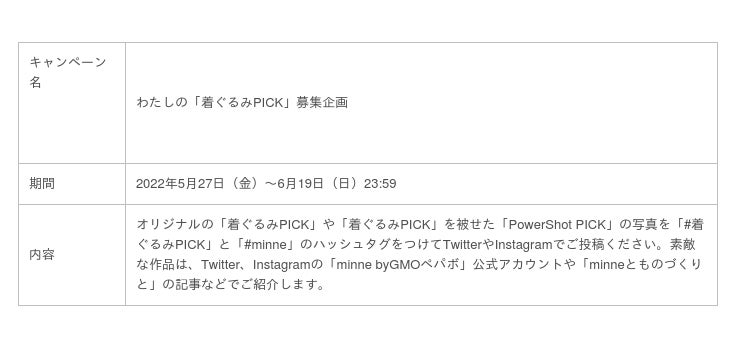 GMOインターネットグループのGMOペパボ株式会社(代表取締役社長:佐藤 健太郎)が運営する国内最大(※1)のハンドメイドマーケット「minne byGMOペパボ」(URL:https://minne.com/)は、2022年5月27日(金)より、自動撮影カメラ「PowerShot PICK」とコラボレーションし、以下の3つの企画を実施いたします。