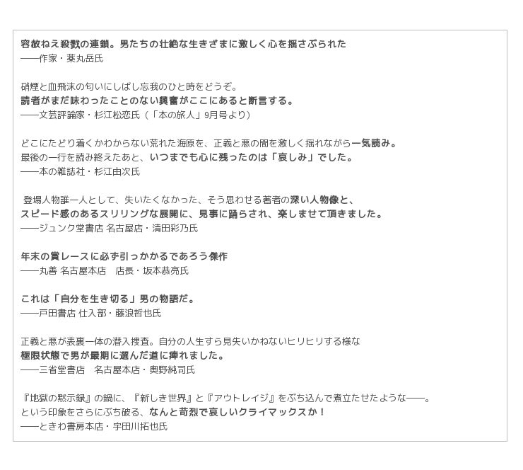 深町氏が「久しぶりに『果てしなき渇き』の頃のような破壊衝動が戻ってきました。ある意味、原点回帰のような作品」「二十一世紀型のアウトローを書いた」と語る本作に、一足早くお読みいただいた方々より熱いコメントが続々と寄せられています。男も女も惚れる人間ドラマをぜひご堪能ください!