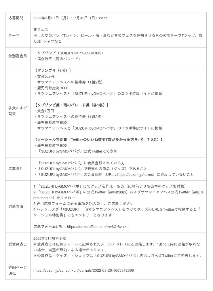 GMOインターネットグループのGMOペパボ株式会社(代表取締役社長:佐藤 健太郎 以下、GMOペパボ)が運営するオリジナルグッズ作成・販売サービス「SUZURI(スズリ) byGMOペパボ」(URL:https://suzuri.jp/)は、2022年10月7日(金)〜10日(月・祝)に鹿児島市・南栄リース桜島広場&グラウンドで開催される大型音楽フェスティバル「THE GREAT SATSUMANIAN HESTIVAL(ザ・グレート・サツマニアン・ヘスティバル) 2022」(ULR:https://www.great-satsumanian.jp/ 以下、サツマニアンヘス)とコラボレーションしたグッズコンテストを開催いたします。