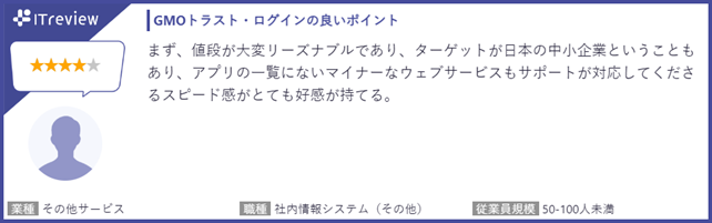 「中小企業向けの1番コストパフォーマンスの良いIDaaS」をコンセプトとする「GMOトラスト・ログイン」は、現在全国約7,000社を超える企業様でご導入・活用いただいています。2016年12月のサービス提供以来、販売の現場から伺うお客様のお声に加え、ITreviewにていただくユーザー企業様のレビュー内容を参考として、機能追加・改善を続けてまいりました。今後も、お客様のニーズに寄り添ったサービス改修や機能化を進め、より幅広い業態・規模の企業にご利用いただけるよう、継続的な満足度向上を目指してまいります。