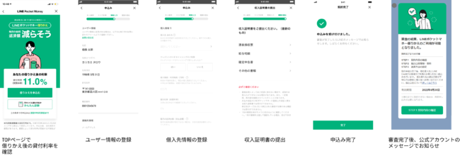 LINEポケットマネーでは、「LINEスコア」を元に仮条件を提示し、審査後に確定した金利が実際の貸付条件となりますが、「LINEポケットマネー借りかえ」では、「LINEスコア」のみで算出した金利を確定した条件として事前提示いたします。*1 申込前に金利を確定できるため、他社と比較検討をしてから申込みが可能です。