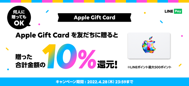 また、新機能の提供開始を記念して、2022年4月20日(水)から4月28日(木)までの期間中、『Apple Gift Card』を贈ると、贈り手のユーザーにLINEポイントを10%還元するキャンペーンを開催いたします。