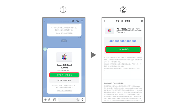 1. LINEアプリに贈り手から届いたメッセージの「ギフトカードを使う」をタップ