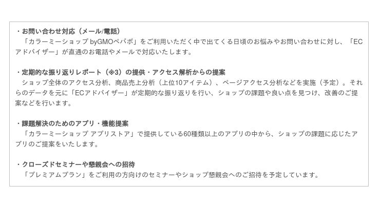 これらのご要望にお応えし、「カラーミーショップ byGMOペパボ」史上最高のサポートを提供するため、この度「カラーミーショップ byGMOペパボ」は、「ECアドバイザー」を設け、大規模なネットショップの運営に必要な機能を利用できる『プレミアムプラン』を新たに提供することといたしました。