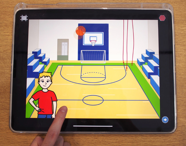 バスケットボールをシュートして、ゴールを狙うゲームです。ボールをタップすると、ボールが跳ねるしくみになっています。タイミング良くボールをタップして、ゴールを狙いましょう。