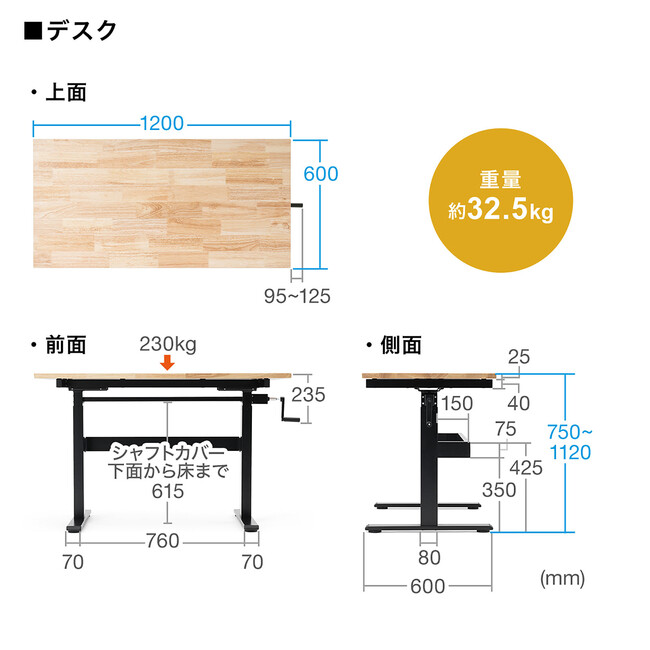 手動昇降デスクのサイズは約W1200×D600×H750〜1120mm、 重量は約32.5kgです。
