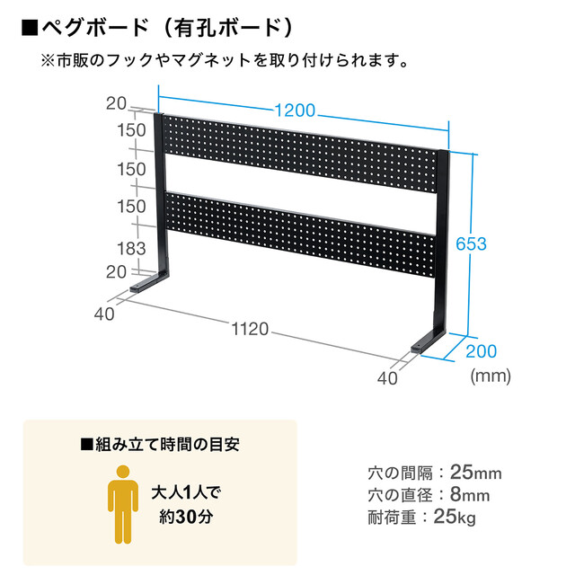 ペグボードのサイズは約W1200×D200×H653mm、 重量は約6.2kgです。