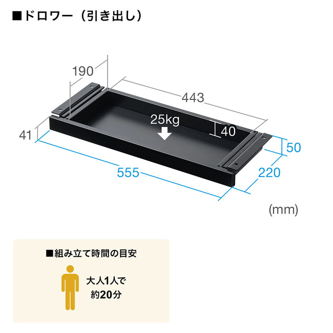 小さな工具や文房具を収納することができる引き出しで薄いキーボードなども収納可能です。耐荷重は約25kgの安心設計です。