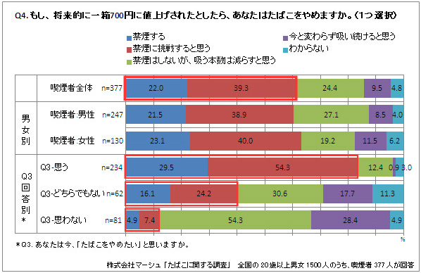 たばこ税の増税に対する賛否は喫煙状況によって大きな差、値上げで700円になっても「今と変わらず吸い続ける」喫煙者の1割−たばこに関する調査−
