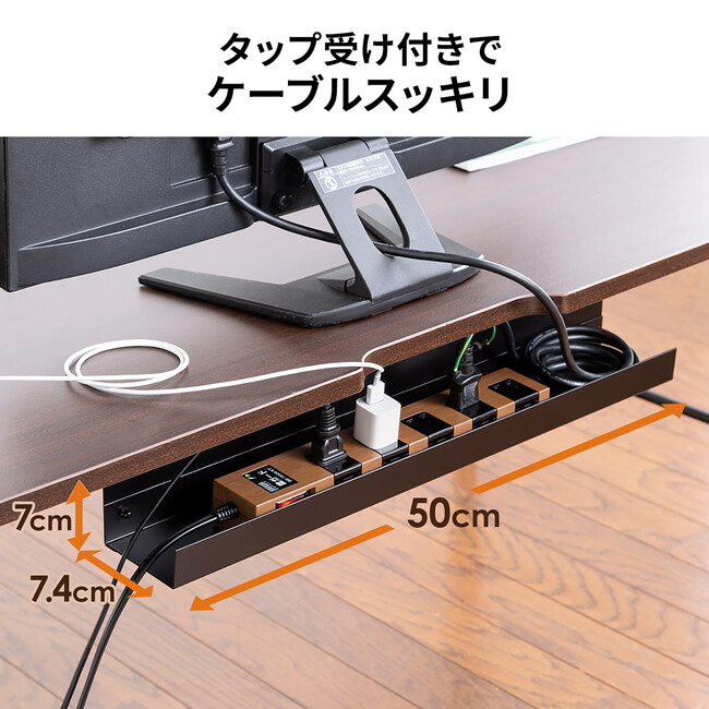 天板中央の奥には、ケーブルを下に逃がす切り欠きと、天板下部にはタップ受けが付いておりメンテナンスがしやすい構造になっています。