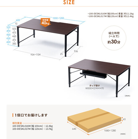 本製品のサイズと重量は100-DESKL016M:約W1000×D600×H400mm/430mm/460mm/490mm/520mm・約11.1kg、100-DESKL017M:約W1200×D600×H400mm/430mm/460mm/490mm/520mm・約12.4kgです。
