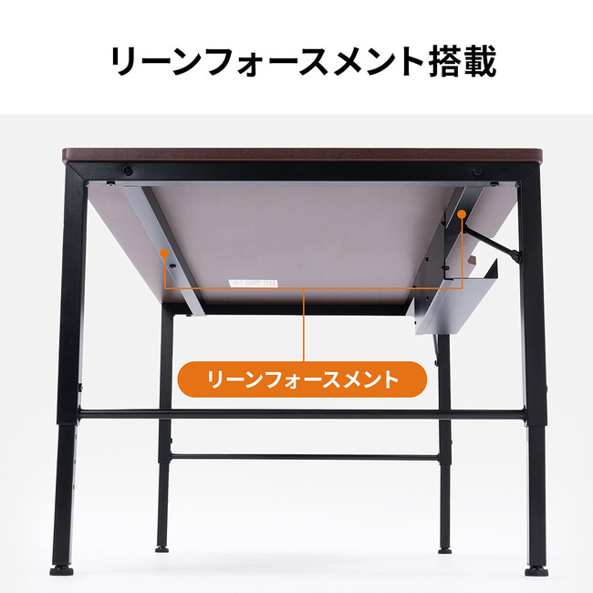 本製品は、横幅100cm(100-DESKL016M)と120cm100-DESKL017M)、奥行60cmのシンプルなローデスクです。高さ調整は約40cm、約43cm、約46cm、約49cm、約52cmの5段階で調整できます。
