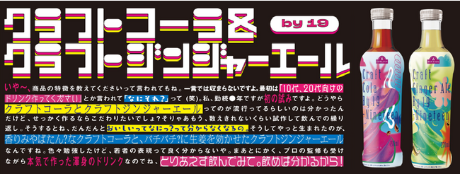 まずは第一弾として「19 Nineteen」シリーズから「クラフトコーラBy19 Nineteen」「クラフトジンジャーエールBy19 Nineteen」の2種類を発売します。「19 Nineteen」シリーズは、「どんな私でも共感、寄り添い」をテーマに「大人でも子どもでもない曖昧な気持ちやときめき、ワクワク感」を、さまざまなスパイスや果実などの素材と組み合わせ、ジュースでは体験できない複雑な味わいと香りで表現したドリンクシリーズです。「19 Nineteen」は、ドリンクのスペシャリストとして世界中でドリンクの講義をしながら、香りを味わう飲み物「香飲」を提案する『香飲家』の監修商品です。