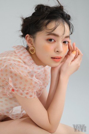 1ルック目のヘルシーなサニーオレンジリップのメイクはこれからスタートする新シーズンに素敵な出会いを引き寄せてくれそうな女のコをイメージ。かみこちゃんの中でオレンジリップを纏った顔はかなり新鮮とのことで「パステルカラーのお洋服に合わせて、お花見とか青空の下で過ごす日に挑戦したいメイクです」と語ってくれました。