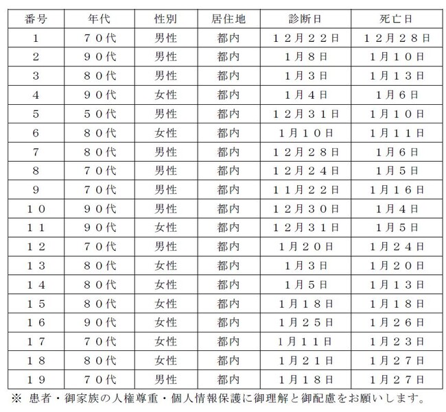 都内で新型コロナウイルスに感染した方が死亡されましたのでお知らせします。