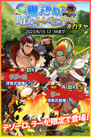 さらに、SSR魂友「テゾーロ」とSSR神器「ラー」が入手可能な期間限定の「雨よやめ!晴天のトレジャーハント」ガチャも登場!