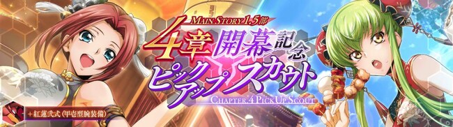 新パイロット、★4C.C.[中華街は誘惑がいっぱい]、★4カレン[大盛況! 昇陽飯店!]が登場。★4カレン[大盛況! 昇陽飯店!]にはナイトメアフレーム「紅蓮(甲壱型腕装備)」が付属!