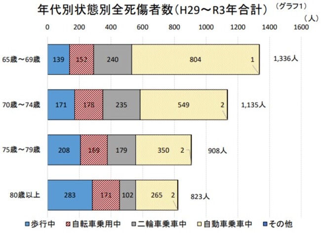 交通事故における全死傷者数のうち「65歳から69歳」が最多、自動車乗車中60%