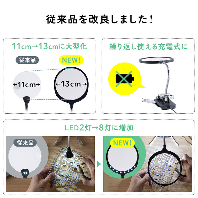 サンワサプライ株式会社(本社:岡山市北区田町1-10-1、 代表取締役社長 山田 和範)が運営している直販サイト『サンワダイレクト』では、大きいレンズで8灯のLEDで明るく照らせる、クリップで挟んで取り付け、スタンドで設置もできる充電式スタンドルーペ「400-LPE020(アームなし)」、「400-LPE021(アーム付き)」を発売しました。